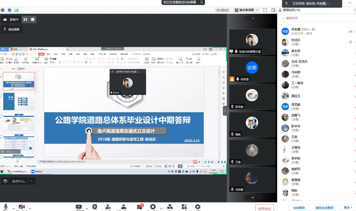 为切实加强毕业设计(论文)的过程管理,及时了解和掌握学生毕业设计(论文)进展及完成情况。根据教务处《关于开展2022届本科毕业设计(论文)中期检查的通知》要求,学院于2022年4月17日到4月24日开展本科毕业设计(论文)中期答辩工作。道路桥梁与渡河工程(国际工程班)、道路工程、道路总体工程、桥梁工程、岩土工程、隧道工程方向学生进行了中期答辩。答辩分为线上和线下两种方式,共涉及175名指导教师、476名学生、33个答辩小组。学校、学院教学督导全程进行了跟踪检查。