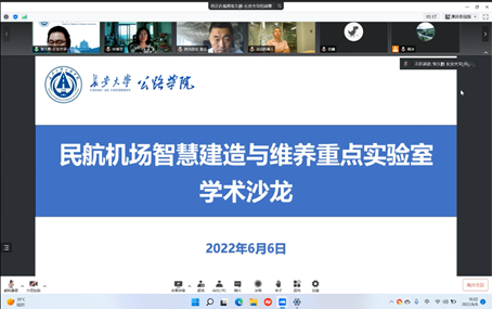 2022年6月6日下午,民航机场智能建造与维养重点实验室采用线上线下相结合的方式成功举办“人工智能技术在民航机场场道建管养的应用”学术沙龙。本次学术沙龙由重点实验室主任汪海年教授召集,特邀长安大学申爱琴教授、郝培文教授、圭目机器人有限公司创始人桂仲成博士、民航机场工程技术研究中心叶松总工程师、西北民航建设集团有限公司戴征总经理、江苏增光新材料科技股份有限公司周庆月总经理做主题发言。公路学院副院长、民航重点实验室副主任张久鹏教授主持学术沙龙,民航西北设计院、咸阳机场、福州机场、翔安机场、邯郸机场等管理和技术骨干以及机场工程系全体教师和在校研究生80余人参加了学术沙龙。