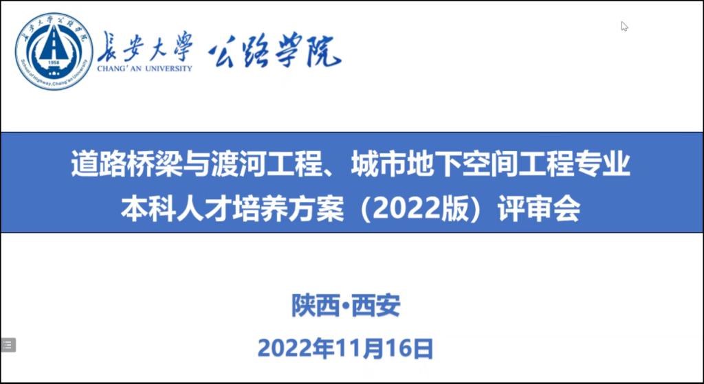 2022年11月16日下午,学院在线上召开道路桥梁与渡河工程、城市地下空间工程专业本科人才培养方案(2022版)专家评审会。专家组由西安理工大学党发宁教授担任组长,北京建筑大学季节教授担任副组长,成员包括西安建筑科技大学宋战平教授、青岛理工大学张素磊教授、北京中航建研航空设计咨询有限公司总经理江慧娟正高级工程师、中交第一公路勘察设计研究院有限公司陈团结正高级工程师、中交第二公路工程局有限公司李强战正高级工程师。公路学院院长陈建勋、副院长张久鹏、培养方案优化工作小组成员及教务管理人员参加会议,会议由张久鹏主持。