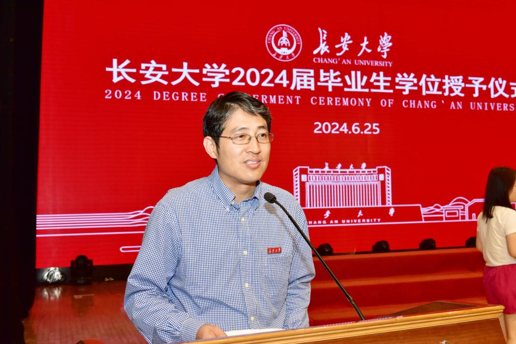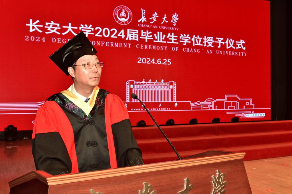 院长汪海年代表学院教师向2024届毕业生表示热烈的祝贺和美好的祝福,向悉心抚育教导同学们的父母和老师表示最诚挚的感谢。他指出,这些年来同学们奋发求学,在党和国家征程壮阔、学校和学院事业蓬勃发展的重要阶段以青春奋斗姿态挺膺担当,书写了新一代青年的青春篇章。他寄语全体2024届毕业生,一是心怀“国之大者”,勇做开路先锋;二是牢记初心使命,争做奉献榜样;三是立志笃学不怠,誓做交通闯将。