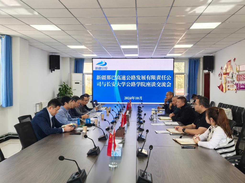 10月13日,公路学院一行与新疆那巴高速公路发展有限责任公司座谈交流。那巴高速党支部副书记、董事、总经理李杰、总经理助理石建疆以及有关部门负责人参加座谈。汪海年介绍了学院科学研究、人才培养现状及校企合作情况。他表示,学院将在双方原有良好合作的基础上,搭建高效、深入的合作平台,为那巴高速公路建设提供科技、人才的支撑。李杰对公路学院一行的来访表示热烈欢迎,他简要介绍了那巴高速公路建设的整体建设及重点、难点等情况。他表示,公路学院师生为那巴高速的设计、建设工作做出了卓越贡献,希望双方进一步加强在高原冻土施工、环境保护,智慧建造等领域合作,为那巴高速公路顺利通车保驾护航。座谈会后,汪海年一行在那巴高速项目十标段施工现场考察,实地查看了桥梁、隧道口等工点,听取了负责人关于智能建造、创新创效及现场标准化管理相关工作的介绍。