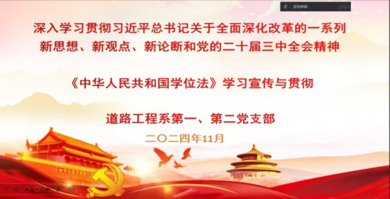 2024年4月26日,第十四届全国人民代表大会常务委员会第九次会议表决通过《中华人民共和国学位法》(以下简称“《学位法》”),自2025年1月1日起施行。为贯彻落实《学位法》,并结合《教育部关于深入推进学术学位与专业学位研究生教育分类发展的意见》(以下简称“《意见》”)的精神,响应学校关于做好《中华人民共和国学位法》学习宣传与贯彻实施工作的号召,公路学院积极组织了一系列学习活动,旨在坚守教育初心,勇担使命,提升教育质量。