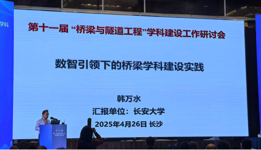 2025年4月25日至27日,第十一届桥梁与隧道工程学科建设研讨会在湖南长沙成功召开。会议主题是“新时代·新挑战·新机遇:全球视野下桥梁与隧道工程学科建设与创新发展”。此次会议由中南林业科技大学主办,吸引了国内外300多名专家学者、行业精英及高校代表参与。长安大学公路学院桥梁工程系共9位教师代表参加了会议,深度融入学术交流与学科发展探讨。韩万水副院长在大会上作题为“数智引领下的桥梁学科建设实践”的专题报告,分享了我国桥梁工程分析软件的建设、发展历程与长安大学的研发、实践经验,引发与会者热烈反响。