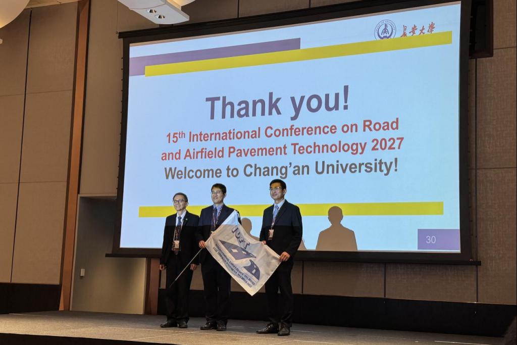 会议期间,代表团全程参与大会开幕式、主旨报告及分会场学术交流活动,围绕智慧骨料、道面性能测试、可持续铺面材料等主题开展学术报告与深入研讨。闭幕式上,公路学院副院长马峰教授作为第十五届会议主办方代表发言,介绍了下一届大会的组织筹备情况,并参加了大会授旗仪式。