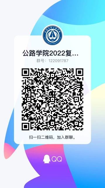 2.请参加复试的考生于2022年3月26日上午12:00时前加入“公路学院2022年硕士研究生复试”群,群号:122091787,考生申请入群时请报“专业+方向+真实姓名”,群主确认是参加复试考生方同意入群)。