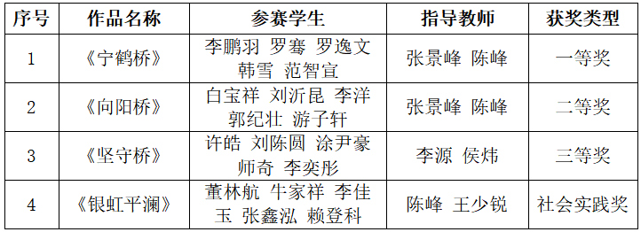 11月30日至12月1日,第六届全国大学生“茅以升公益桥—小桥工程”创新设计大赛决赛在福州大学举行。中铁大桥勘测设计院首席科学家高宗余院士、北京工业大学教授杜修力院士、重庆大学教授杨永斌院士等多位专家出席决赛现场。学院指导老师陈峰、张景峰和辅导员李明阳带队参加比赛。经过激烈角逐,我院4项作品获一等奖1项,二等奖1项,三等奖1项,社会实践奖1项,学校获优秀组织奖。