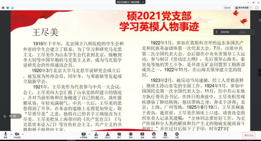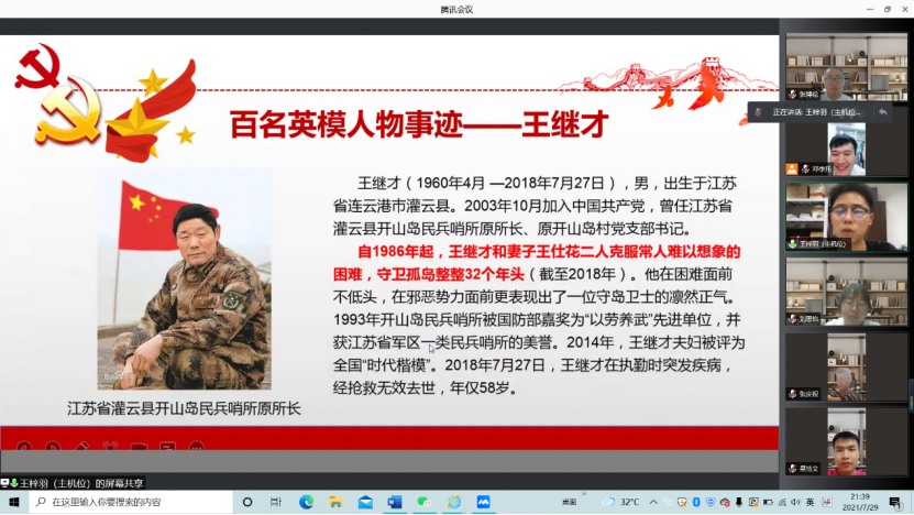 在中国共产党成立100周年之际,为深化党史学习教育,厚植爱国主义情怀,进一步推动红色精神的传承,公路学院研究生党支部在党委号召下于7月5日以来陆续开展“五个一百”系列学习会议,本次学习教育以学习百名英模人物为主题展开。