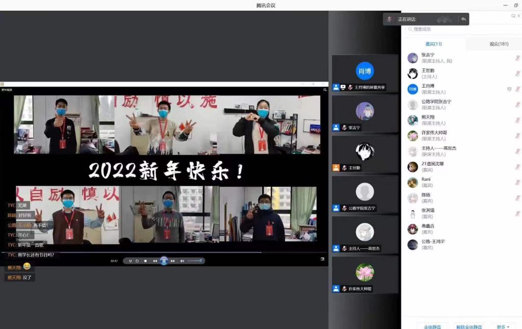 2022元旦来临,为进一步增强同学们的抗疫斗志、坚定抗疫必胜信念、丰富学生封控期间的日常生活,公路学院于12月31日晚举办2022年元旦云端跨年演唱会,院党委副书记刘徐、学办全体辅导员老师及600余名同学参与线上活动。
