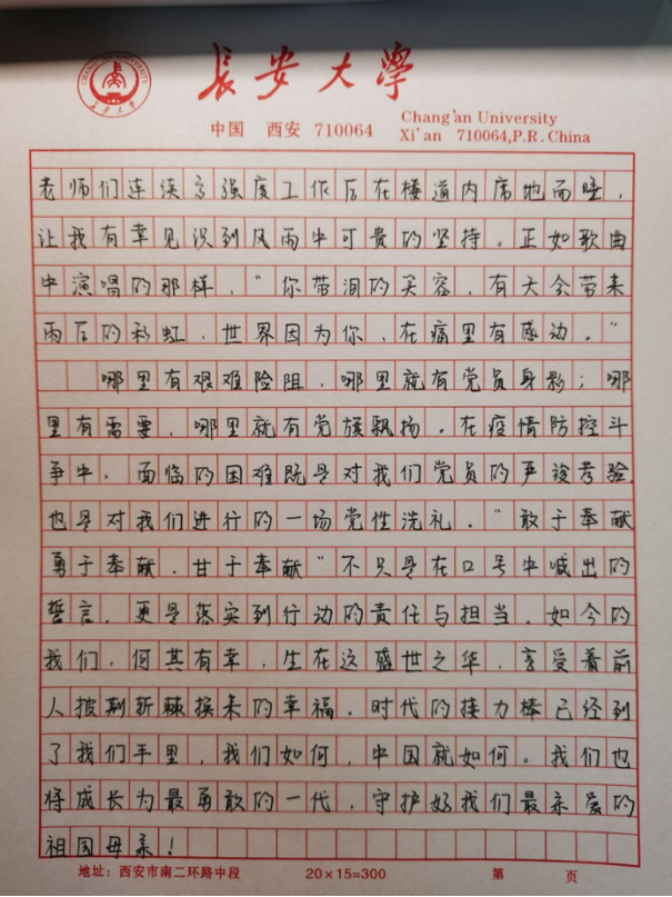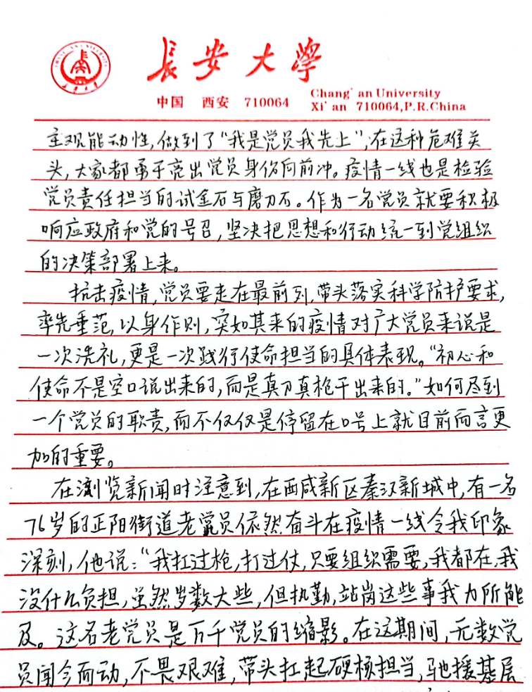 通过此次抗击疫情的亲身经历和一份份的思想汇报,公路学院本科生党支部全体成员更加深入地理解了作为党员、作为积极向党组织靠拢的新时代青年学子所应承担的责任和担当,也更加坚信只有坚持党的领导,我们国家才能凝聚起万众一心、众志成城的强大精神合力,才能战胜各种艰难险阻!