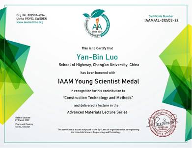 近日,长安大学公路学院张岗教授、罗彦斌教授、蒋玮教授收到国际先进材料学会(International Association of Advanced Materials,IAAM)执委会发来的贺函,张岗教授当选国际先进材料学会会士(Fellow of IAAM, FIAAM),以表彰他在“桥梁防火保护新方法与新材料”领域所取得的杰出成就;罗彦斌教授荣获国际先进材料学会青年科学家奖(IAAM Young Scientist Medal),以表彰他在“隧道建造新技术和新材料”领域所作的重大贡献;蒋玮教授荣获国际先进材料学会青年科学家奖(IAAM Young Scientist Medal),以表彰他在“智能铺装新材料和新结构”领域所作的重大贡献。