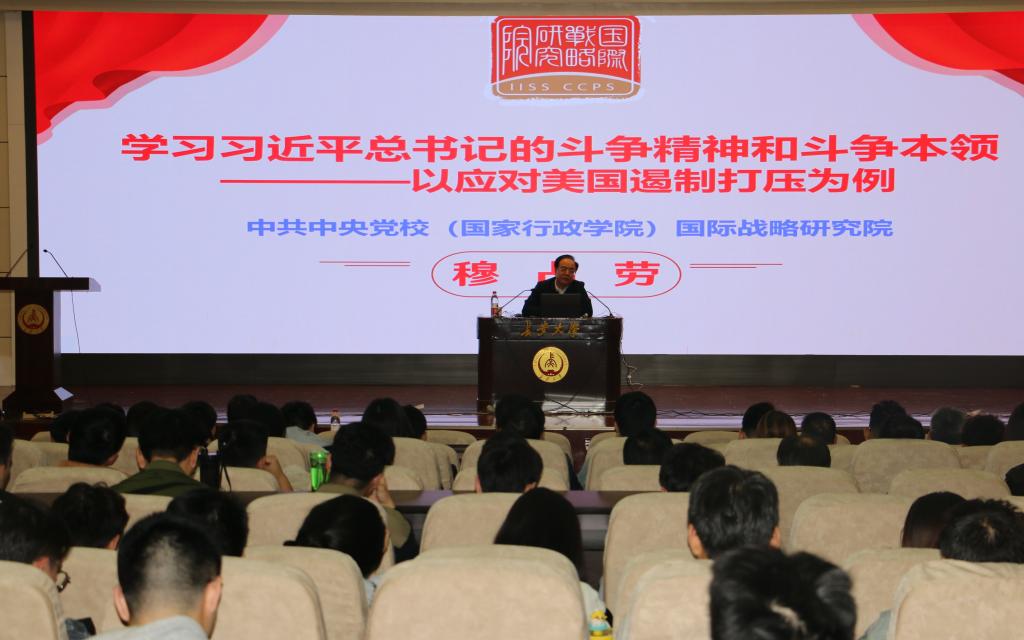 在南校区北院学术交流中心报告厅举行理论学习中心组(扩大)会议,邀请中共中央党校(国家行政学院)国际战略研究院穆占劳教授作《学习习近平总书记斗争精神和斗争本领》的专题辅导报告。学院党委理论学习中心组成员、全体教工党员和部分学生党员代表300余人共同参加了学习。辅导报告由学院党委书记汪海年主持。