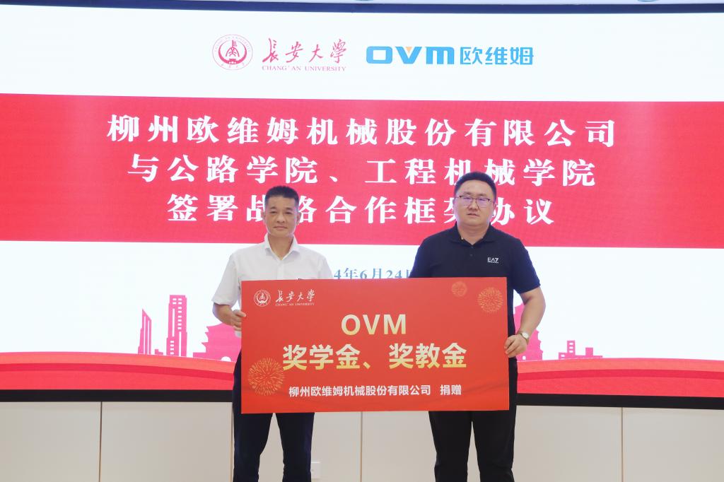 会上,公路学院院长汪海年、工程机械学院院长叶敏分别代表学院与欧维姆公司签署了战略合作协议,双方将充分发挥各自优势领域,积极开展合作。公路学院副院长韩万水、工程机械学院党委副书记雷剑分别接受了欧维姆公司捐赠的教学用具和奖、教学金。