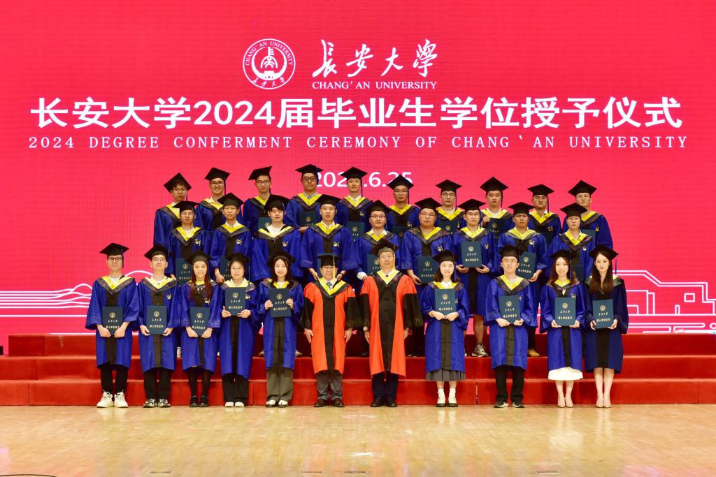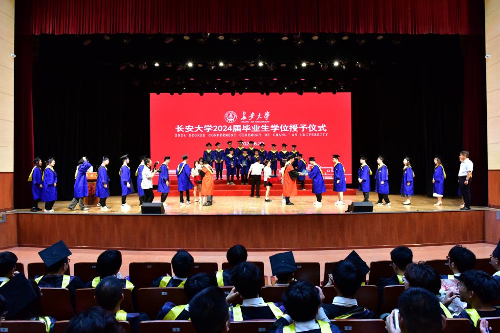 副院长马峰宣读博士和硕士学位授予名单,教学主管张晔宣读学士学位授予名单,院长汪海年、党委书记张久鹏为毕业生颁发学位证书。