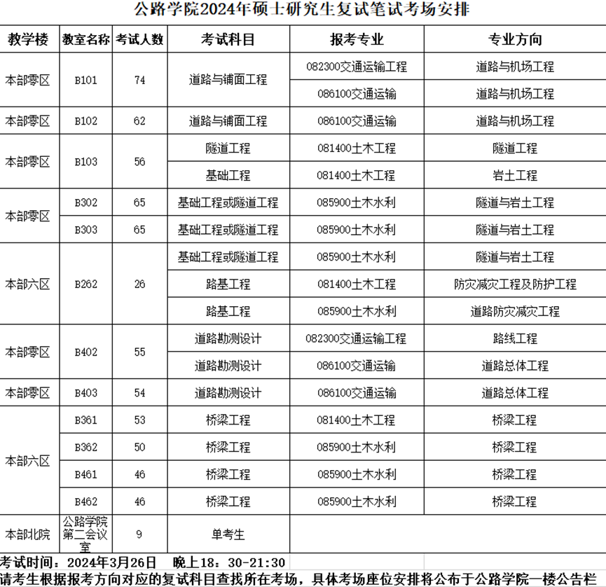 各位2024年硕士考生: 现将公路学院2024年硕士考生笔试考场公布如下,详细名单见附件。
