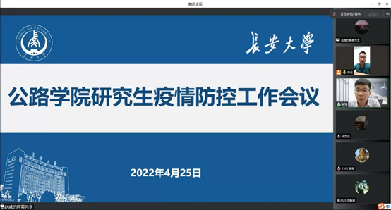 为落实学校关于研究生疫情防控工作的安排,切实推进学院研究生疫情防控工作落实,4月25日晚,公路学院组织召开研究生疫情防控工作会议。会议采取线上的形式召开,研究生各年级负责人和各班班长参加,学院副院长蒋玮、副书记刘徐出席,会议由研究生辅导员李光主持。