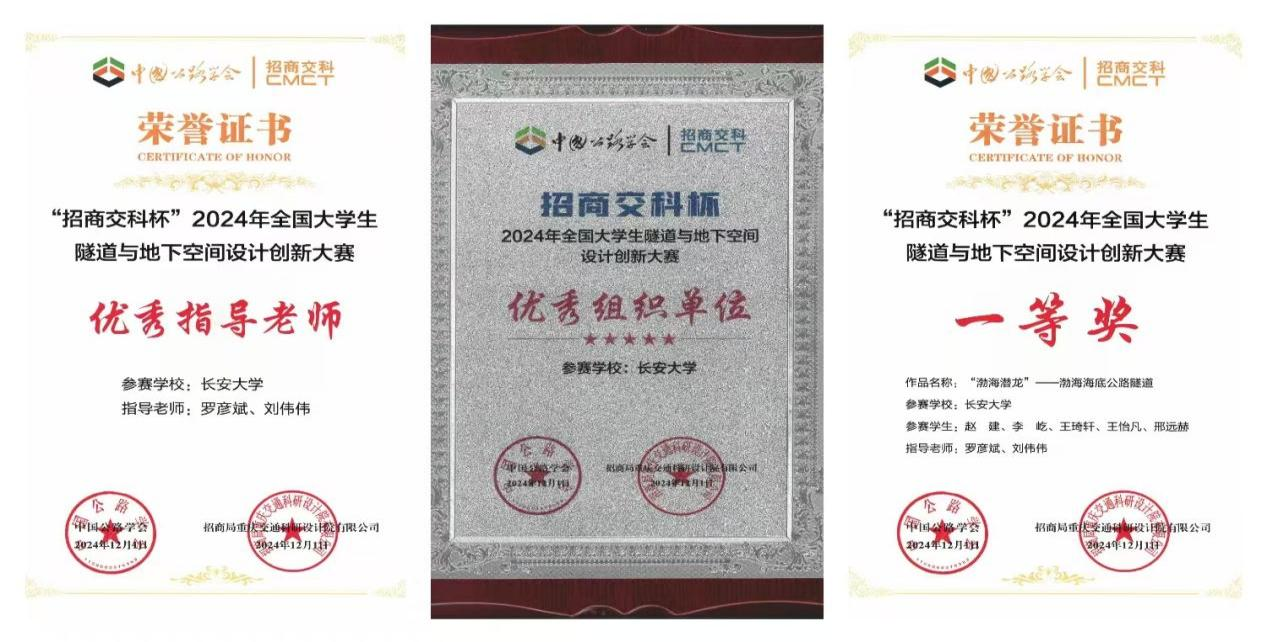 中国公路学会、招商局重庆交通科研设计院有限公司主办,中国公路学会隧道工程分会、重庆交通大学承办的“招商交科杯”2024全国大学生隧道与地下空间设计创新大赛全国总决赛于2024年12月1日在重庆举行。经过一天激烈的角逐比拼,由我院罗彦斌教授和刘伟伟副教授指导,赵建、李屹、王怡凡、王琦轩和邢远赫组成的队伍斩获一等奖,长安大学获得优秀组织单位,罗彦斌教授和刘伟伟副教授获得优秀指导教师。