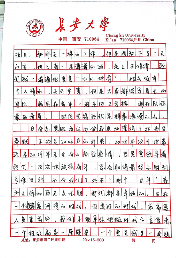 通过此次抗击疫情的亲身经历和一份份的思想汇报,公路学院本科生党支部全体成员更加深入地理解了作为党员、作为积极向党组织靠拢的新时代青年学子所应承担的责任和担当,也更加坚信只有坚持党的领导,我们国家才能凝聚起万众一心、众志成城的强大精神合力,才能战胜各种艰难险阻!