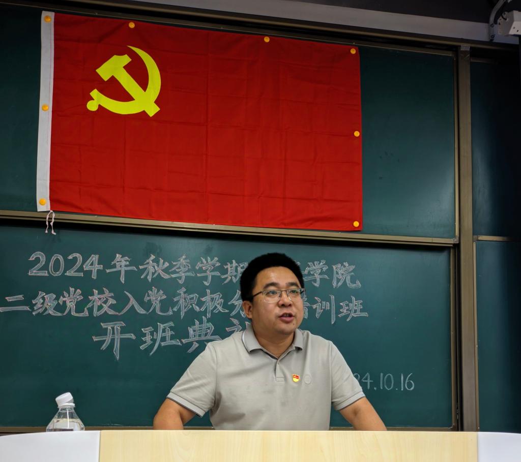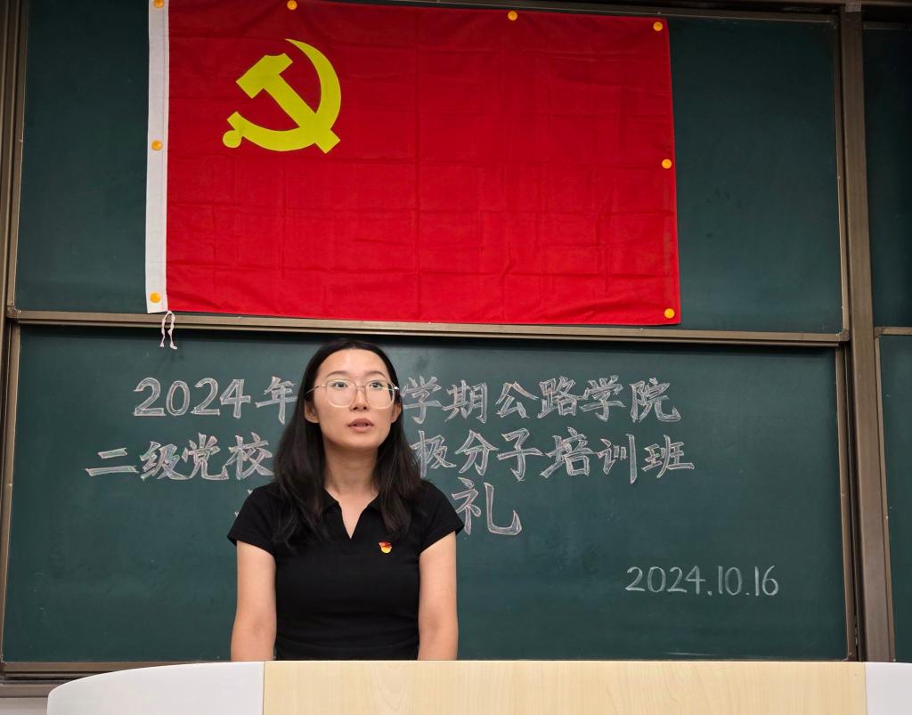 2024年秋季学期公路学院二级党校入党积极分子培训班开班典礼于10月16日在WH1307教室举行。公路学院党委书记张久鹏、党委正处级组织员廖谦、党委副书记贾历波、学办主任卢毅、团委副书记王达、全体辅导员及57名受训学员参加此次典礼。典礼由副班主任刘亦澜主持。
