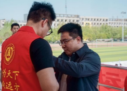 公路学院党委书记张久鹏为党员志愿者佩戴党徽